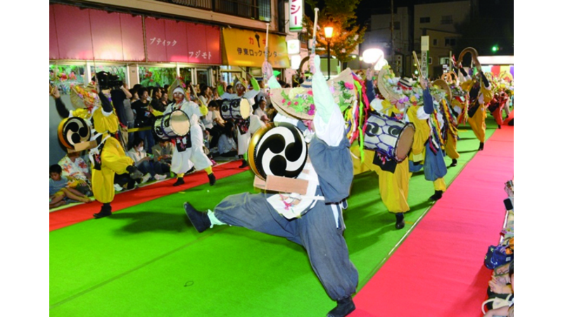 伊東大田楽は、いにしえの田楽法師の舞いに伊東温泉の歴史や文化、郷土芸能などを取り入れ、市民演者の爆発するエネルギーを盛り込んだ壮大でダイナミックな野外劇です。会場は幻想的な雰囲気を漂わせます。