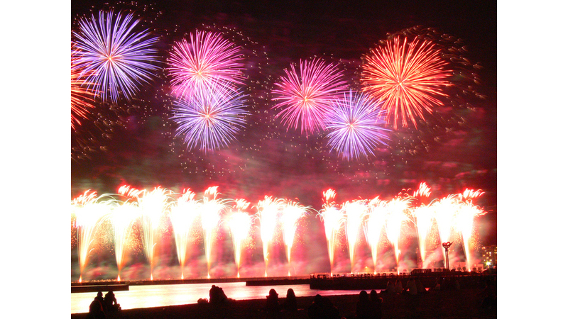 夜空と水面に映える美しい花火をお楽しみください。