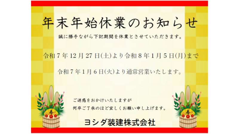 平素は格別のご高配を賜り、厚くお礼申し上げます。 さて、誠に勝手ながら下記のとおり、年末年始休暇とさせて頂きます。 休業期間中、お客様には大変ご迷惑をお掛けいたしますが、 ご理解くださいますようお願い申し上げます。 休業期間 2025年12月27日(土)~2025年1月5日(月) ※2025年1月6日(火)より通常通り営業を再開いたします。