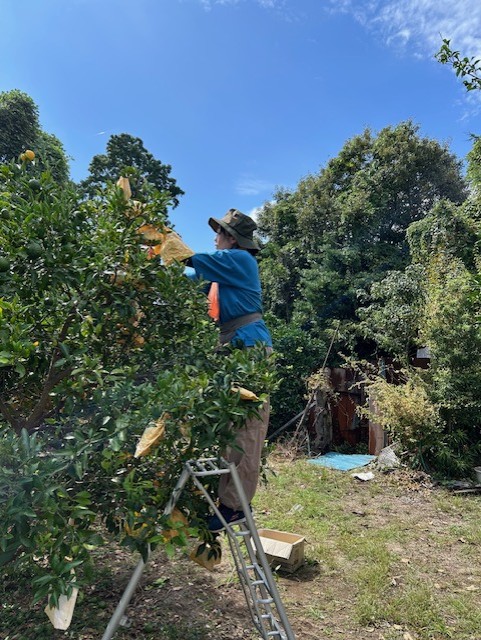 まだ本調子とはいきませんが、半日だけみかん畑へ一緒に出かけ、デコポンの袋かけ作業をしました。