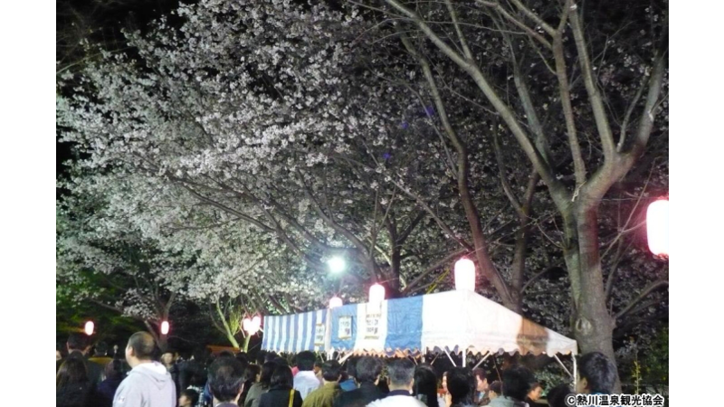 熱川桜坂公園のライトアップされた夜桜の下、道灌太鼓の上演やお酒・みそ汁等のサービス夜店が出て賑わいます。