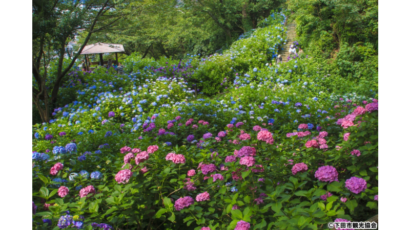 広大な敷地を埋めつくす、総計15万株・300万輪の紫陽花は訪れた人を圧倒するほどです。 園内を巡る遊歩道に延々と続く大輪の花は、ひと時の静寂さをもたらしてくれるでしょう。