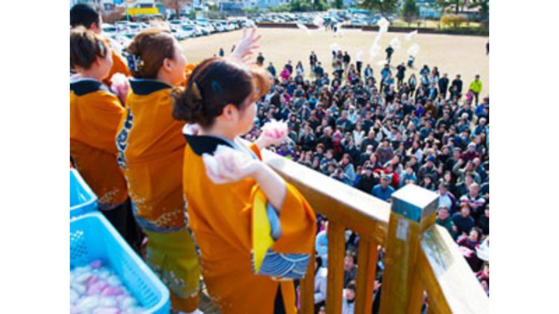 新春のお祝いに、ハート型の紅白の餅を花時計の高台より投げます。 新年のスタートは紅白のハートのお餅でお祝いしよう!