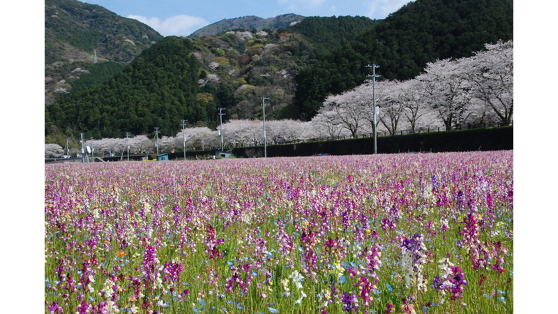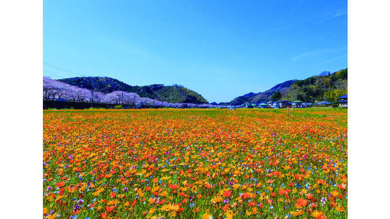 平成12年度からスタートした大規模花畑事業。約6万2千㎡(東京ドーム以上)の広大な農閑期の田んぼに6種類の花の種が撒かれ、3月上旬から次々に開花し、辺り一面見渡す限りの花畑を演出し、訪れるひと達を楽しませてくれます。