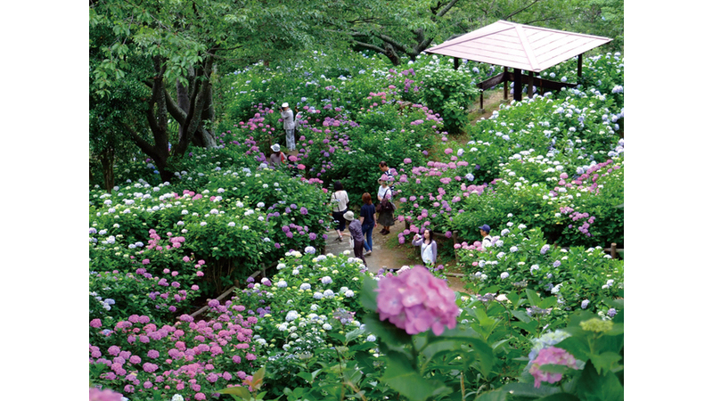 あじさいの種類は多く、園内でも「クロジク西洋アジサイ」「ウズアジサイ」「アナベル」など名前の付いたあじさいを100種以上見ることができます。園内を巡る遊歩道に延々と続く大輪の花は、梅雨の頃艶やかに輝き、ひとときの静寂をもたらしてくれることでしょう。