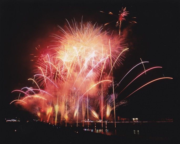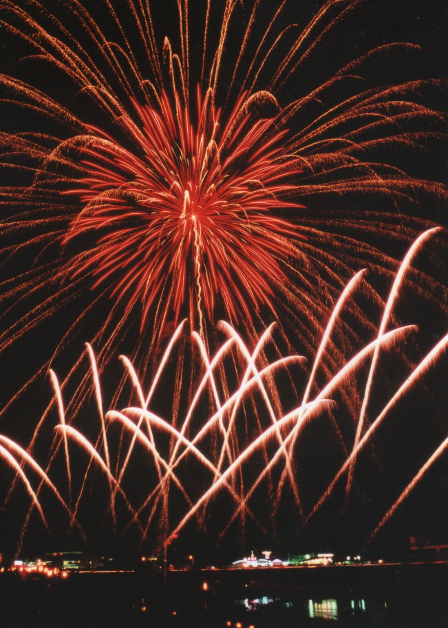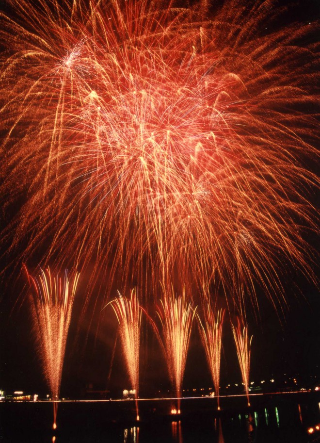 早打ち、スターマイン、金色の空中ナイアガラなど約8000発の花火が打上げられ、特に幅約500mの滝を描く空中ナイアガラは必見です。
