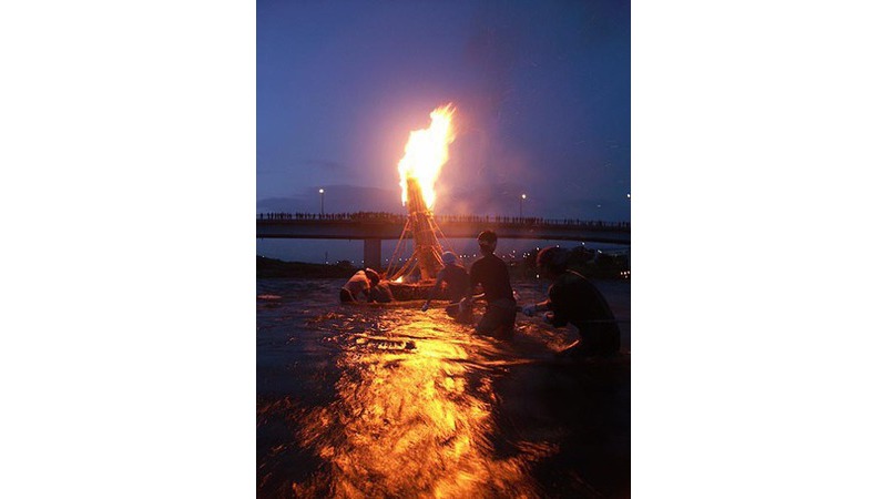 約3メートル四方の竹枠に麦藁を敷き詰め、厚さ1メートル程のイカダを作り、その中央に長さ5から6メートルの松明を立てます。これを狩野川の神益麻志(かみますまし)神社下あたりまで運んで、松明に火をつけ、十人ほどの若者が操り、「ウ、ウ、ウワハイ」と囃し、これを神島橋の上にいる子どもたちが受けて返し、神島橋の下流まで囃子声と共に松明が燃え尽きるまで流していきます。