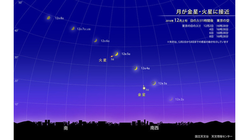 日の入り直後の南西の空では、低いところでは金星が鋭い輝きを放ち、その左上には火星も見えています。12月3日から5日にかけて、三日月から上弦にむかう月がこの二つの惑星の近くを通ります。3日には、マイナス4等級を超える明るさの金星と月が並んで輝くようすを楽しめます。5日には火星と月が3度以下まで近づいて見えます。金星に比べるとかなり光度の低い火星ですが、空が暗くなってくれば、月のそばで控えめに輝く火星が見つけられるでしょう。