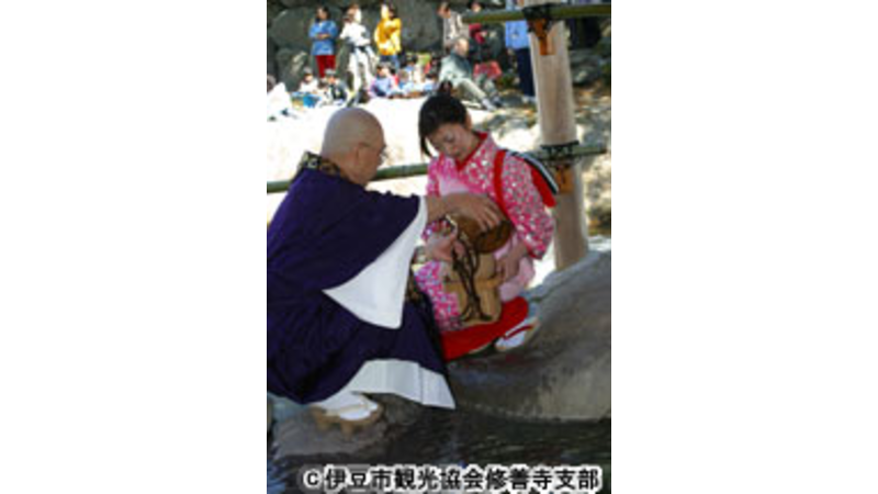 修善寺温泉発祥の「とっこの湯」を1200年前に発見した弘法大師と温泉への感謝祭。 市内から選ばれた娘さんおよそ30名が揃いの着物姿で、今も湧き続ける「とっこの湯」を 僧侶に汲んでもらい、手桶に受けて、稚児などと共に約250名の行列で温泉街をパレード。