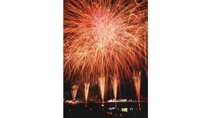 早打ち、スターマイン、金色の空中ナイアガラなど約8000発の花火が打上げられ、特に幅約500mの滝を描く空中ナイアガラは必見です。