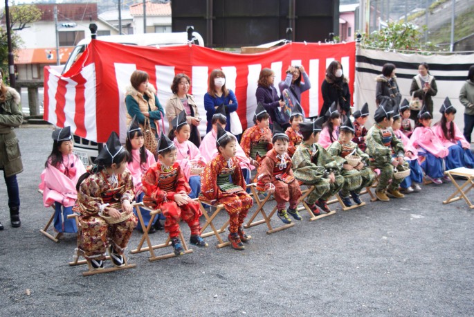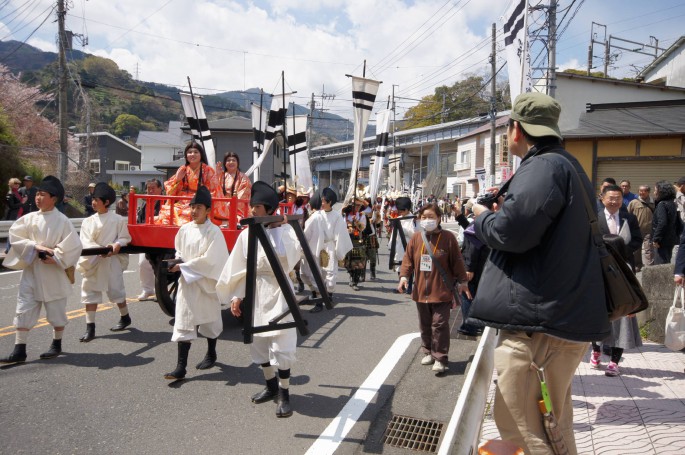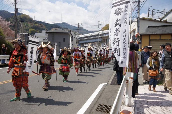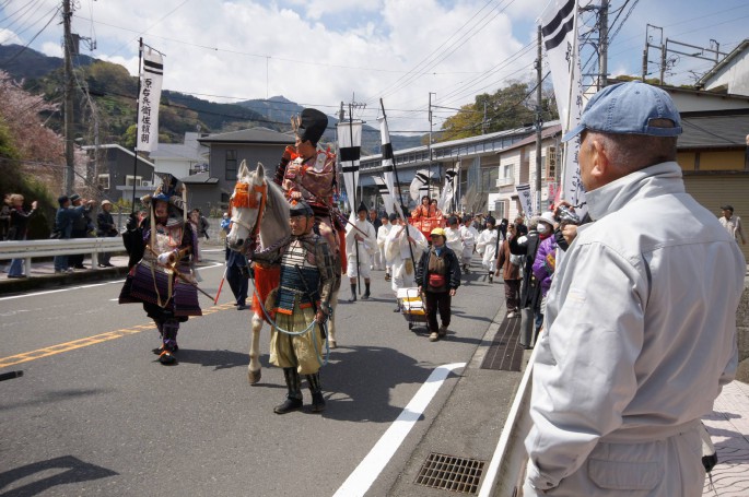 武者等の勇姿で、五所神社から湯河原駅間(約900M)をパレードします。