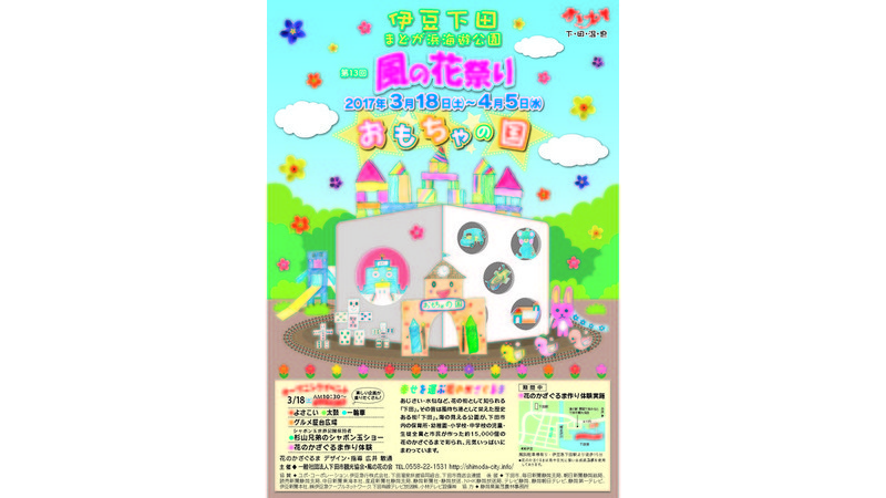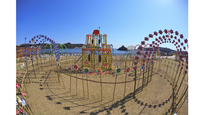港が広がる芝生の「まどが浜海遊公園」に、下田市内の保育園・幼稚園・小学校・中学校の児童・生徒全員が作った20種類16,000本以上もの花のかざぐるまが元気いっぱいにまわっています。
