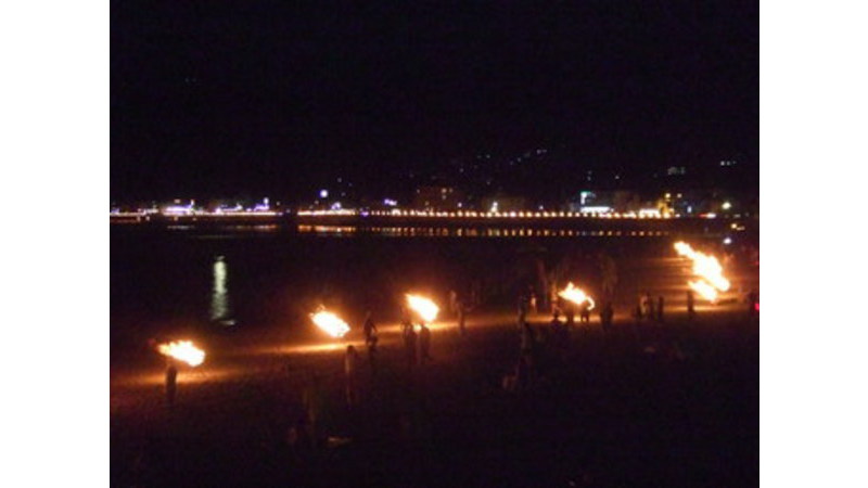 古くから伝わる伝統行事で、270基ものかがり火が多賀湾沿いと長浜ビーチに一斉に灯されます。海岸から流される500もの灯籠とともに水面に映ってゆらめく様は荘厳そのものです。伊豆多賀温泉の夏の風物詩です。