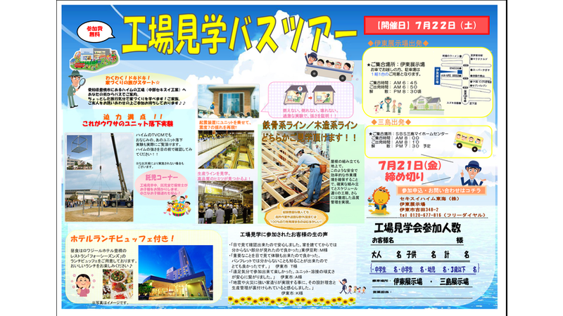 7/22(土)住まいの工場見学会(参加費無料!!) のご案内です。