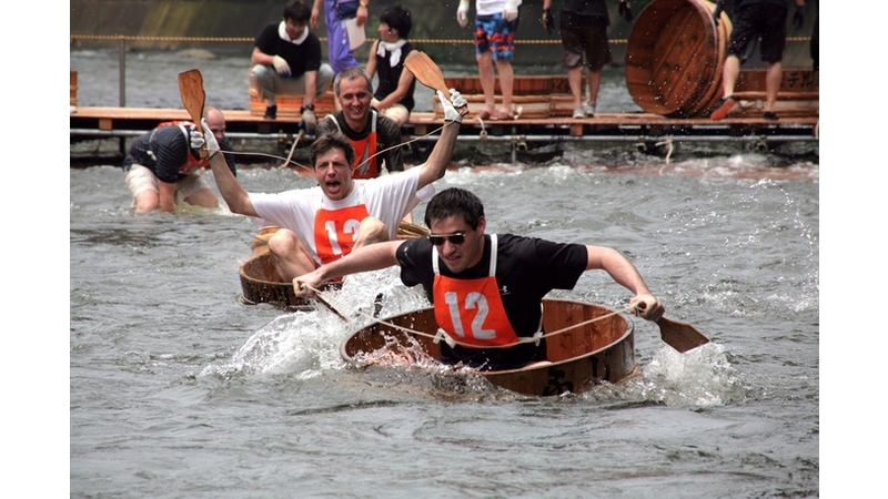 タライ乗り競走は直径1m、深さ30cm程の大きなタライに乗り、しゃもじのようなカイで漕ぎながら川を下る非常にユニークなレースです。