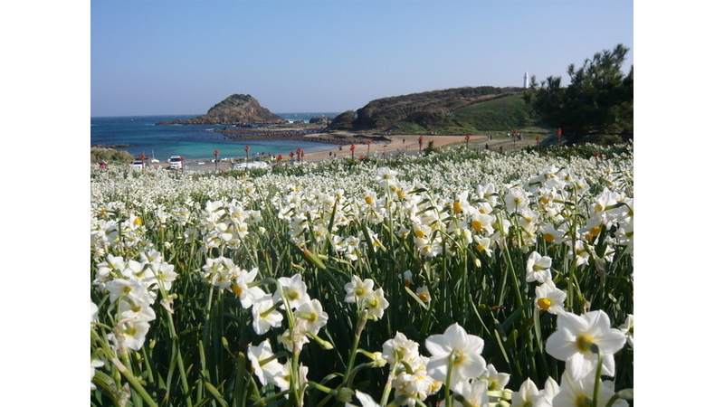 下田・須崎半島の先端に位置する爪木崎では、毎年300万本もの純白の野水仙が辺り一面を埋め尽くします。