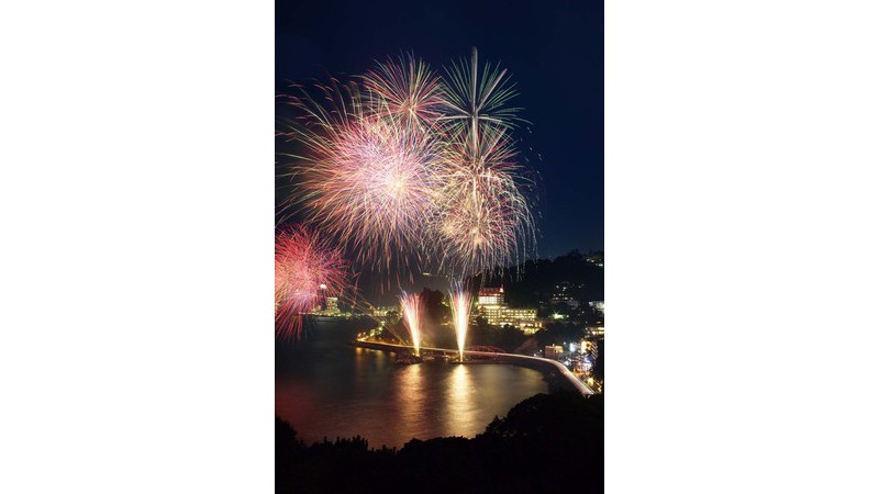 毎年、8月3日の夜、盛大に催される伊豆山花火大会。伊豆山港から打ち上げられる花火は、 水面に色とりどりの模様を映しだし、見る者を魅了します。熱海の花火大会は盛大なことで 有名ですが、この伊豆山の花火大会はそれに匹敵するほどの規模を誇り、特等席まで用意されています。 特等席ははなんと言っても各旅館・ホテルから眺める花火。湯上がりの火照った体に涼風が心地よい。 杯でも傾けながら、ゆったりのんびり花火を眺める。これこそこの上ない贅沢と言えるでしょう。