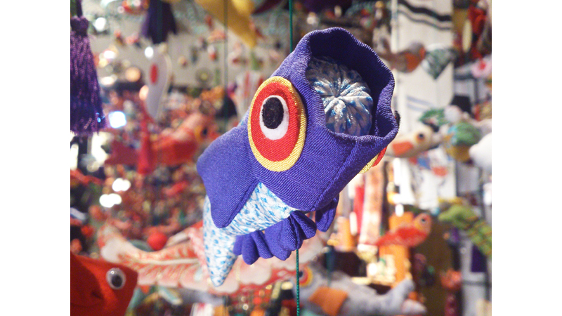 五月晴れの空に悠々と泳ぐ鯉のぼりのように健やかに、のびのびと育ってほしい。 そんな願いをこめたつるし飾りで、端午の節句の男の子をお祝いする稲取温泉に伝わるつるし飾りの新しい形です。