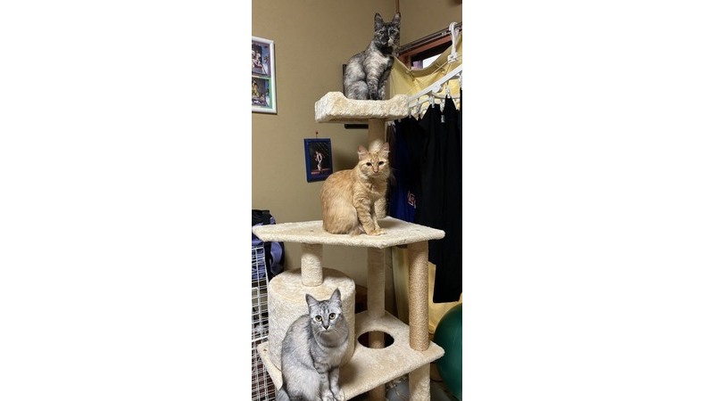 70歳を目前に日々、断捨離に励んでおります。 先日も、ほとんど春男(=^・^=)には使われなかったキャットタワーを捨てようと分解していたら... たまたま近所に住む友人が立ち寄り「捨てちゃうなら聞いてみる」と知り合いに連絡したら 貰って頂けました。 後日、写真が送られてきて3匹の猫たちはお気にめしたようです!(^^)!